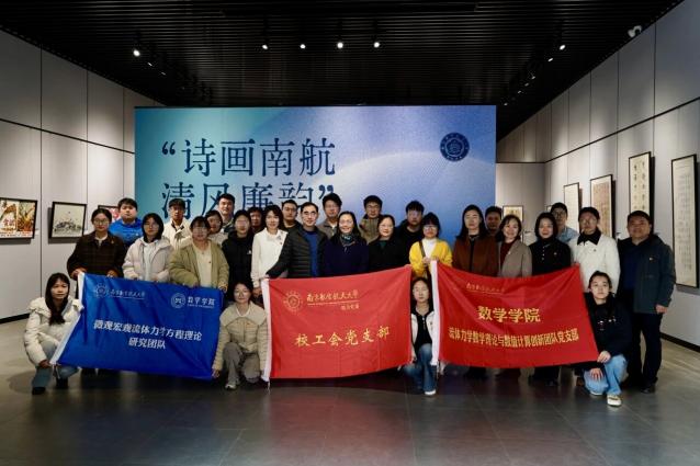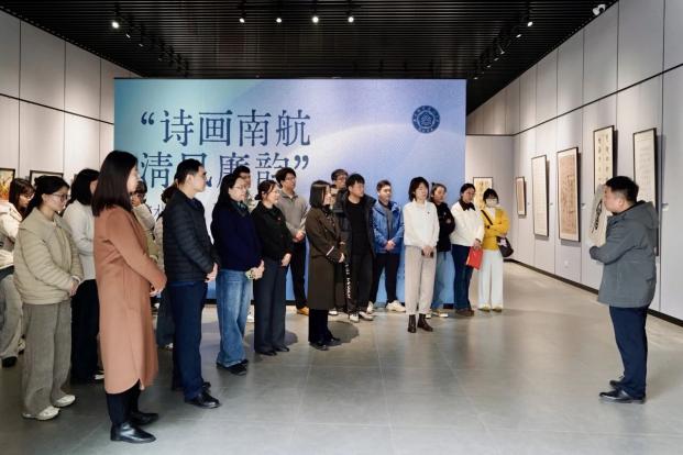 随后,师生党员在郭洪豹的讲解下,集体走进“诗画南航,清风廉韵”艺术作品展,沉浸式观“廉”。本次展览是第六届“清廉南航”宣传教育周重点活动,由学校纪委办主办,艺术学院、离退休处、天目湖校区联合承办,集中展出我校师生原创作品80余件,展品聚焦廉洁主题,以笔墨丹青传递清廉价值、弘扬正气新风。郭洪豹为大家详细介绍了展出作品的创作背景、艺术手法与廉洁文化内核,同志们驻足观赏、交流感悟,每一幅翰墨佳作都成为鲜活的廉洁教育教材,让工会干部与师生党员在审美熏陶中深化廉洁文化认同。