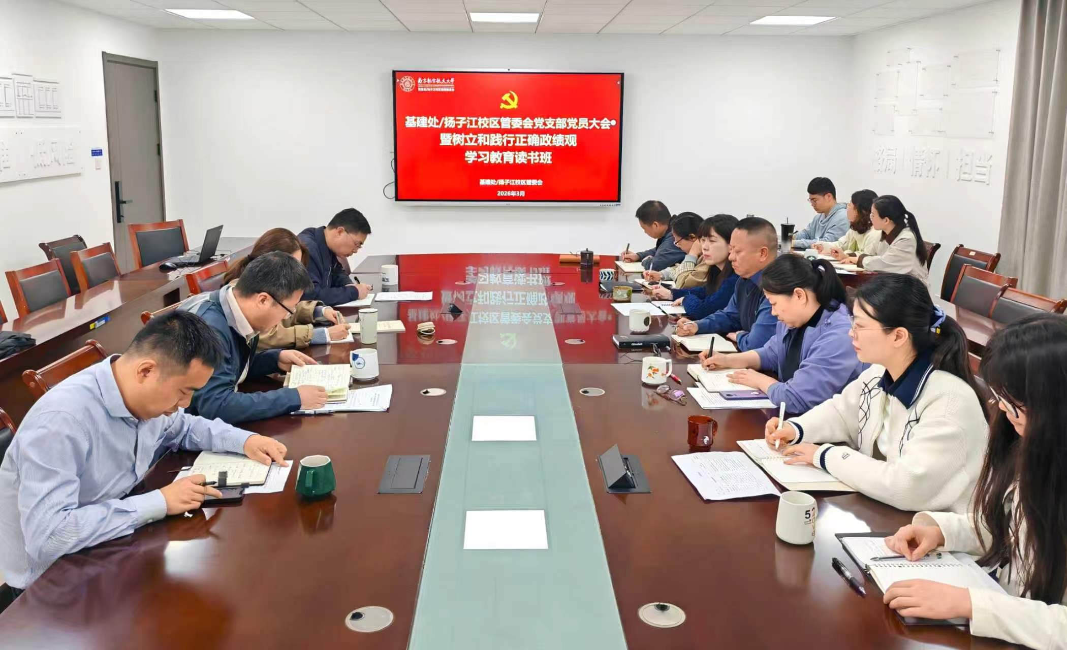 3月30日,基建处/扬子江校区管委会党支部召开党员大会暨举行树立和践行正确政绩观学习教育读书班开班式,并开展首期读书班专题学习,深入学习贯彻习近平总书记关于树立和践行正确政绩观的重要论述。会议由支部书记王炜主持,支部全体党员参会。